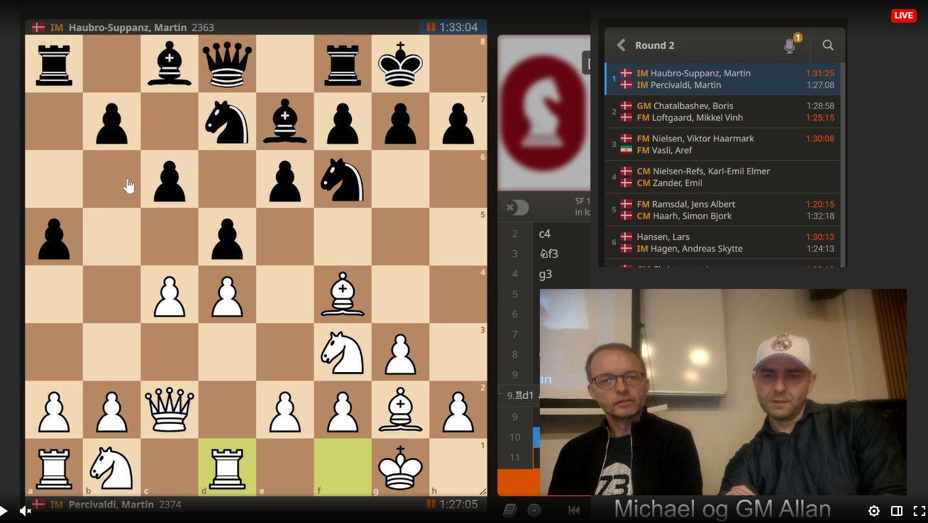 Livedækning: Følg 12 partier på lichess (link). De tre stærkeste grupper samt en fjerde udvalgt gruppe blev live-transmitteret hver runde.